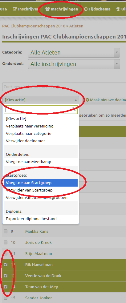 Go to the registrations overview, select 1 or more competitors you want to add to the startgroup, then click on '[choose action]' and 'add to startgroup' then select the relevant startgroup.