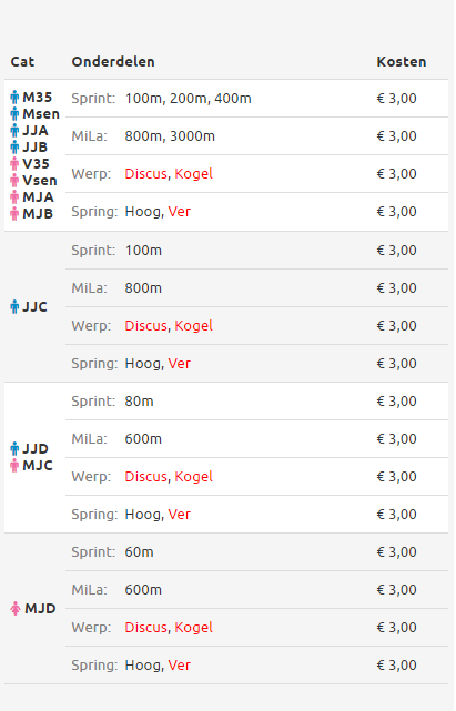 Athletics.app shows for the master categories only 'M35' and 'V35' on the competition summary page.