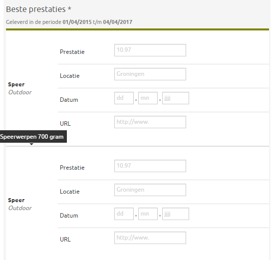 When registering for a competition, I have to enter my best performance. If I do not enter this performance but continue, I can no longer change/add performances. Use case: Select competition where the best performance must be entered. Click on register as athlete. Select an event. Click on Next.